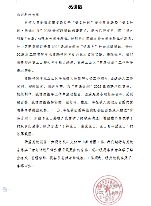 近日,体育学院收到一封来自共青团临沂市兰山区半程镇委员会的感谢信,对工商管理(体育)2019学生贾瑞伟充分发挥自身优势,高质量完成一系列实习工作提出表扬,对学校在人才培养及“青鸟计划”工作上做出的努力表示感谢。