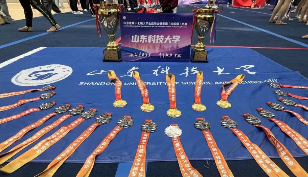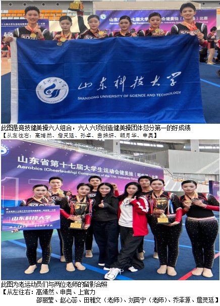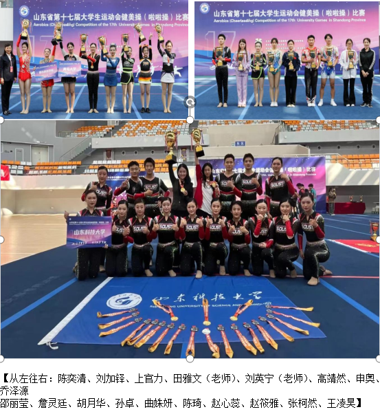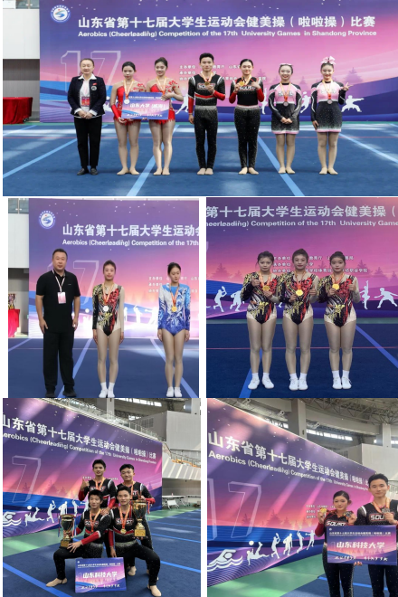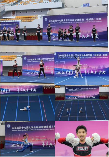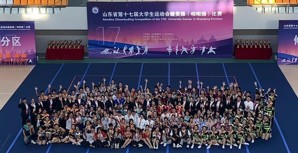 由山东省教育厅、山东省体育局主办的山东省第十七届大学生运动会健美操(啦啦操)比赛9月30日至10月5日在潍坊职业学院(滨海校区)举行。来自全省高校72支代表队、近800名运动员参加本次比赛我校健美操(啦啦操)队首次参加本项赛事,得甲组三人操冠军、双人花球冠军、女子单人操亚军和第四名混合双人操季军和第四名、集体花球啦啦操季军、男子单人操第六名团体总分第一名的好成绩。