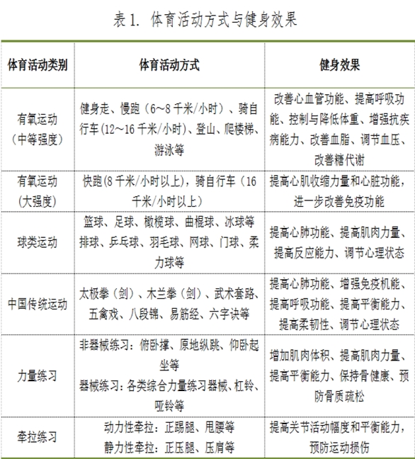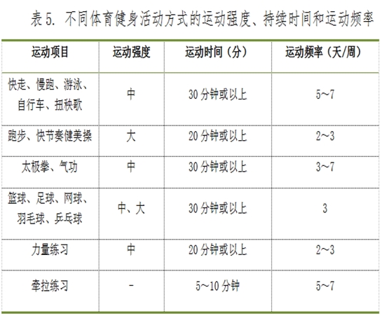 ——运动方式:中等强度有氧运动、球类运动、中国传统运动方式、柔韧性练习。
