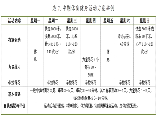 在这一阶段,体育健身活动方案基本固定,逐步过渡到长期稳定的体育健身活动方案。中期体育健身活动方案举例见表7。