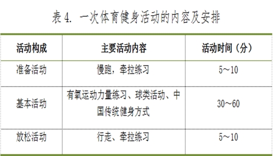 一次完整体育健身活动内容应包括准备活动、基本活动和放松活动三部分,见表4。
