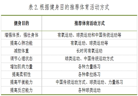 根据运动健身目的推荐的体育活动方式见表2。