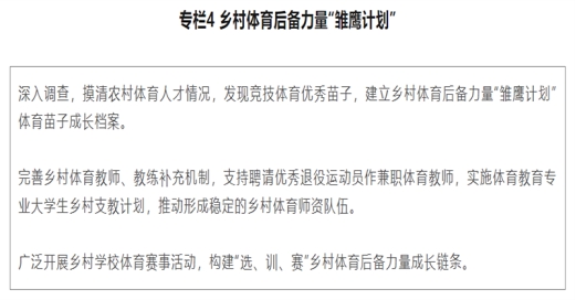 (十三)深入推进体教融合。实施乡村体育后备力量“雏鹰计划”。扶持田径、足球、篮球、排球等项目在乡村学校的推广与普及。常态化组织开展乡村青少年体育赛事活动,提升学生身体素质、健康意识和运动习惯。扶持乡村学校开设武术、舞龙舞狮、中国式摔跤、毽球、棋类等中华优秀传统体育项目课程。支持采取“请进来”“走出去”等多种方式,鼓励学校基于学生发展需求,利用校外体育资源开设中华优秀传统体育课程。
