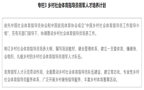 (十一)加强乡村体育人才队伍建设。建立健全乡村社会体育指导员培训体系和工作机制。各级社会体育指导员的考核认定工作向回乡创业大学生、乡村体育教师等各类体育人才倾斜。建立乡村体育人才信息数据库。加大乡村社会体育指导员领军人才和乡村体育骨干人才培养。开展体育专业院校毕业生基层成长计划、体育人才下乡支教等专项活动,引导体育专门人才更好地在农村就业创业。建立人才激励机制,定期在全国群众体育先进表彰中推选乡村体育工作先进典型,增强乡村体育工作者的荣誉感和责任感。