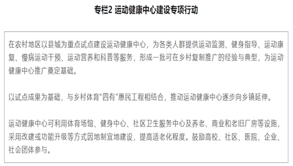 (七)深入开展运动促进健康行动。广泛开展“体育进乡村,运动促健康”科普活动和“健康中国 母亲行动”,提升农民体育健康素养。加强乡村医生科学健身指导能力和体卫融合技能培训。推动体卫融合服务机构向乡村覆盖延伸,支持乡村医疗卫生机构提供科学健身指导服务。实施运动健康中心建设工程,以改扩建为主要方式建立一批运动健康中心,推动建立体育和卫生健康等部门协同、全社会共同参与的运动促进健康新模式。优化国民体质监测和科学健身指导服务,研究完善适合农民的运动项目库、健身指导方案和健身活动指南。充分发挥体育的健康促进作用,促进乡村学龄儿童和老年人身心健康。研究推广适合老年人的体育健身休闲项目、方式和方法,发挥运动在老年人慢性病防控中的积极作用,发布老年人体育健身活动指南。