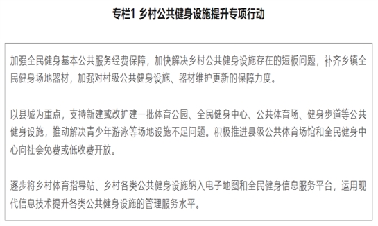 (二十)打造绿色生态体育空间。依托乡村山水林田湖草沙及古村落、古驿道、古遗址等特色生态和人文资源优势,推进国家步道体系建设,完善户外运动配套设施,打造汽车露营地、航空飞行营地、山地户外运动营地等户外运动综合体,形成与自然生态融为一体的全民健身新空间。